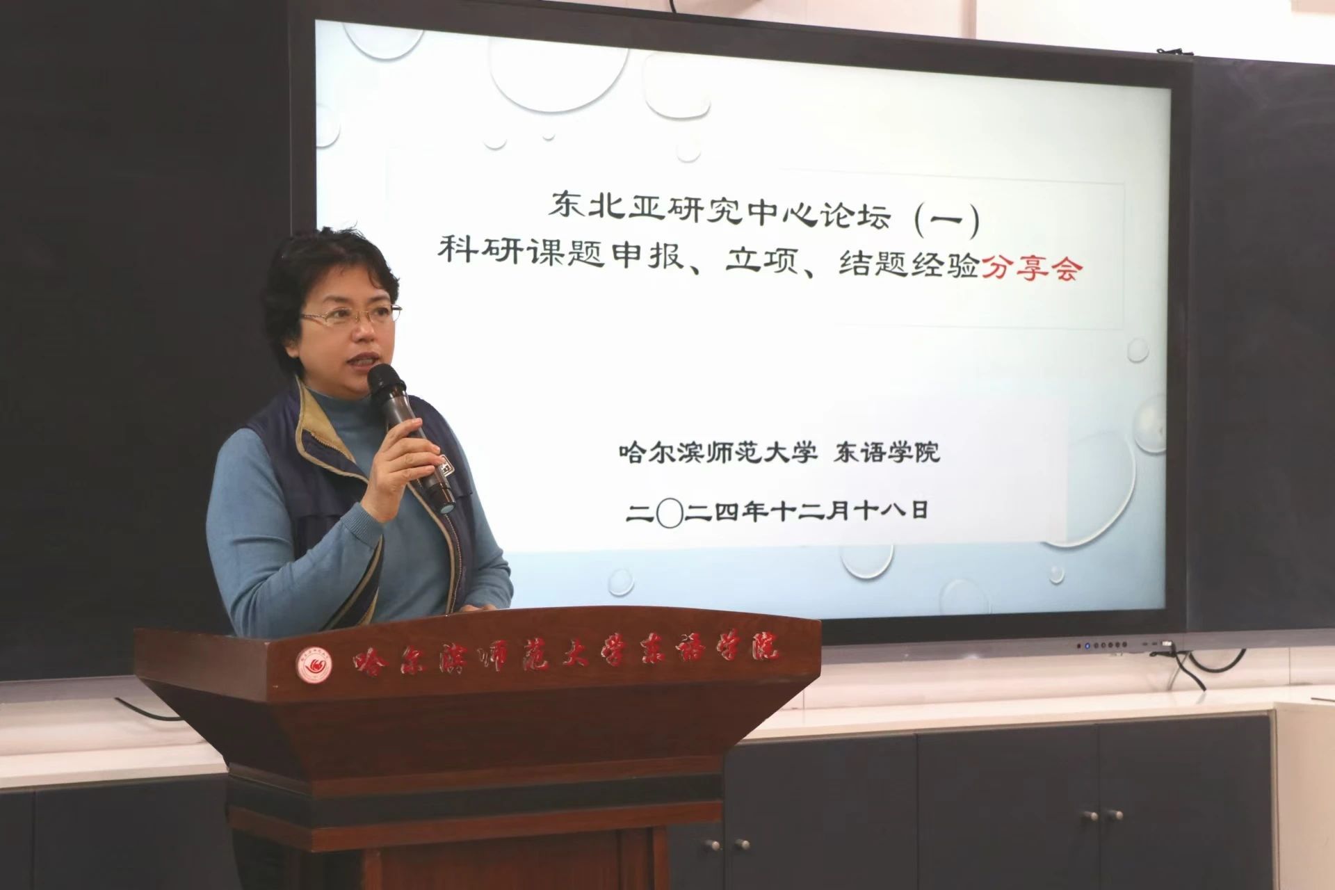 会上,首先宣布了东北亚研究中心正式成立,并召开了第一次东北亚研究中心论坛。为此学院邀请了5名教师结合各自申报国家社科基金项目及其他重要科研项目的经验以及自身学术研究方向,从选题、立项依据、工作基础、研究方案、申报书撰写等多个方面分享经验并给出宝贵建议。郑杨教授分享了提升科研能力的方法,鼓励大家积极参与各类学术研讨,吸取成功经验;蔡雨教授结合博士论文完成情况,对选题及研究内容进行分析解读,以及两次申报省哲社课题成功经验,来说明选题的重要性;黄明侠副教授结合自身科研经验,针对结项时遇到的困难和问题,与大家分享了解决的途径和办法;王佳梦副教授结合本次省哲社课题《日本战时疏散体验书写及战后思想史位相研究》,分析立项成功的原因,指出立项选题要选择具有可行性、可持续研究价值;朴晶老师从近三年国家社科项目以及省哲社立项项目的题目入手,分享了博士科研启动基金项目申报的经验,立项选题要有跨学科融合、选题要有亮点。